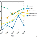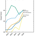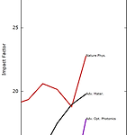 얼마 전 2017년 학술지별 Impact Factor 가 발표되었습니다. 그래서 물리학, 광학, 광자학, 플라즈몬학, 나노과학, 재료공학 분야 학술지의 최근 5년간 Impact Factor 변화 추이를 그려보았습니다. Impact Factors 자료 출처: http://jcr.incites.thomsonreuters.com 보기 편하도록 IF 구간별로 나눠서 그려봤습니다. 30 < IF < 45 15 < IF < 31 10 < IF < 20 8 < IF < 14 6 < IF < 10 3 < IF < 6 2.5 < IF < 4 1.0 < IF < 2.5 0.5 < IF < 1.5 *표시는 제 논문이 있는 저널입니다. - 급상승한 저널 Physical Review XNanophotonicsJournal of..